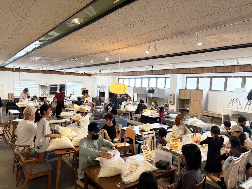 参加者の皆さまは、COCO-MATのクッションカバーに天然ラテックスを丁寧に詰めながら、世界にひとつだけのオリジナルクッションを制作されました。お子様連れのご家族が協力して作業する姿や、完成したクッションを嬉しそうに抱える姿など、笑顔あふれる光景が会場のあちこちで見られました。